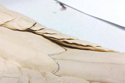 Pencil in feather group separations (these will be feather edges) and then draw in feathers, from small to large. Be aware of the overlap from each group. During painting these can create a translucent effect. Mark in some areas for contours.
