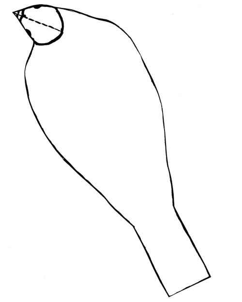 Locate the center/pivot point on top of the head and trace the top pattern at the desired angle and position. You have some freedom here, as birds hold their heads in many positions—pulled back, jutting out, and so forth. Now locate the end of the primaries. From the end of the tail it’s 68–74 mm. Mark the front of the wing at the wrist (or what most call the “shoulder”). The wing chord of a female is 185–205 mm. Make a cut to define the wrist location. Remove most of the wood from the side of the head.