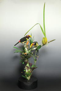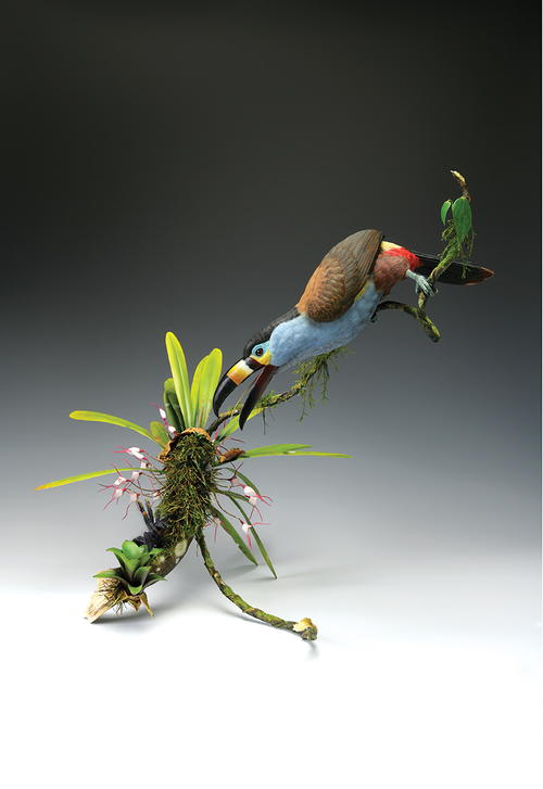 Two years later, Tom won his first best in world for decorative life-size wildfowl at the Ward World Championship with this plate-billed mountain toucan. Notice the tarantula near the base of the orchid plant. -