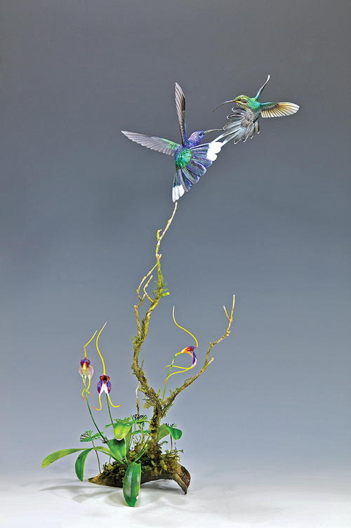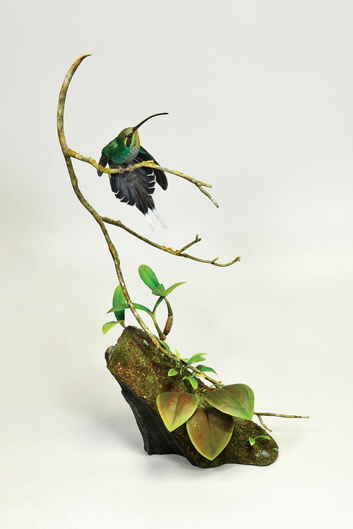 The winning piece depicted a plate-billed mountain toucan perched on an orchid and confronting a frighteningly realistic Ecuadorian purple tarantula. He had a friend in Ecuador send him photos, including some of the orchid he used for the piece. He carved the tarantula from wood but hand-glued each individual hair into place. “I wasn’t expecting to win,” he says. “I was told by a number of people that I didn’t have a chance.” They were wrong.