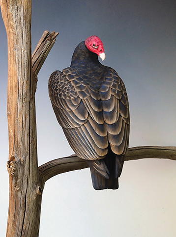 He applies his background in jewelry to his work by casting feet or working with metal in his habitats. He likes the way you can bend metal and change it, and he doesn’t see any reason to carve a delicate leaf out of wood when he is more comfortable doing it with metal. Some carvers prefer to use only wood in their pieces, but Tom incorporates whatever he needs. He might carve a hummingbird bill out of brass, make a mold, and cast it. “The Ward brothers, they didn’t follow any rules,” he says. If they wanted to carve a standing duck, they would. If they wanted to use metal snips from coffee cans, they would do that, too. “There are no rules,” Tom says. “It’s about being innovative.”