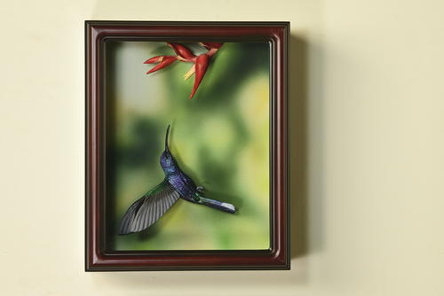 The hummingbird is one of the shadow boxes he creates to sell at shows.