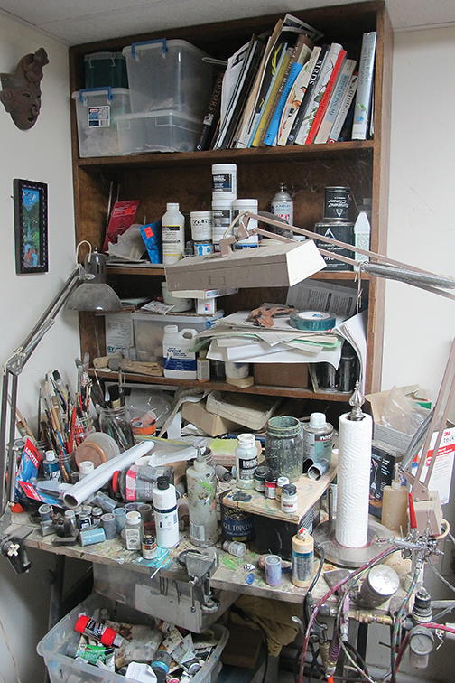 Tom Horn’s cluttered workbench is where he creates his award-winning carvings. He still has terrariums with frogs nearby. The paint station obviously gets a lot of use. So does the Zeiss surgical loop Tom uses for detail work.