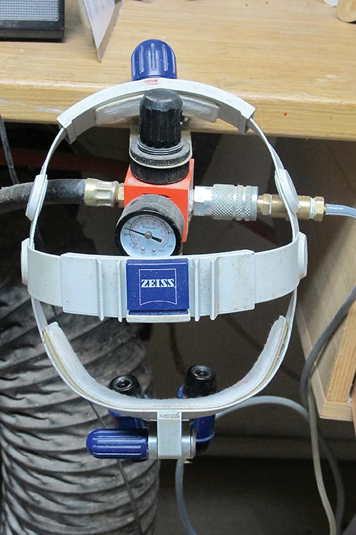 With the pose and setting determined, Tom begins carving. He is a power carver and his cluttered work space includes dozens of bits, mostly diamonds. He has constructed smaller racks that hold only the bits he will need for his current project. One thing he learned from jewelry making is to get rid of excess material quickly. “I’ll start with a chain saw if I have to,” he says. “I’m about getting rid of it fast.” As he gets immersed in the detail, though, he begins to employ what he says is his most essential carving tool—his Zeiss surgical loop, which looks like a pair of tiny binoculars attached to a plastic headband.