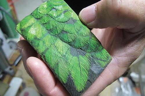 Many people want to know exactly how Tom creates his iridescence, the shimmering look that has become one of his trademarks. “Iridescence is basically like a prism,” he explains. Instead of reflecting one color, it refracts all the colors in the spectrum. “It’s pretty complicated and complex how I do it,” he says, and that required about three years of experimenting and a lot of work with study pieces. For a golden quetzal piece, he received a feather from a bird at the Bronx Zoo and brought it home to study under a microscope. Instead of explaining his process, though, he encourages people to develop their own methods that work for them.