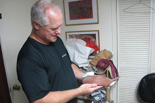 He’s come a long way—here Tom contemplates a ruddy he did when he first tried carving as a teenager.